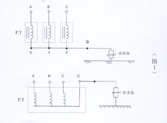 未接消諧器前,三個單相壓變高壓繞組尾(X•Y•Z)直接接地或是并聯(lián)成中性點(0)接